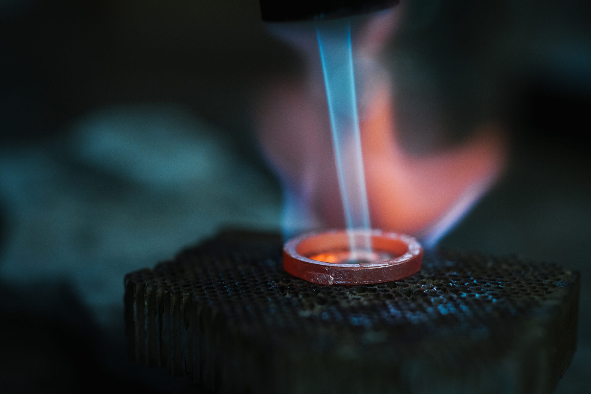 バーナーの炎に包み、1000度近くまで地金の温度を上げたところで、その隙間へ融点の低いゴールドをすっと流し込んでいく。