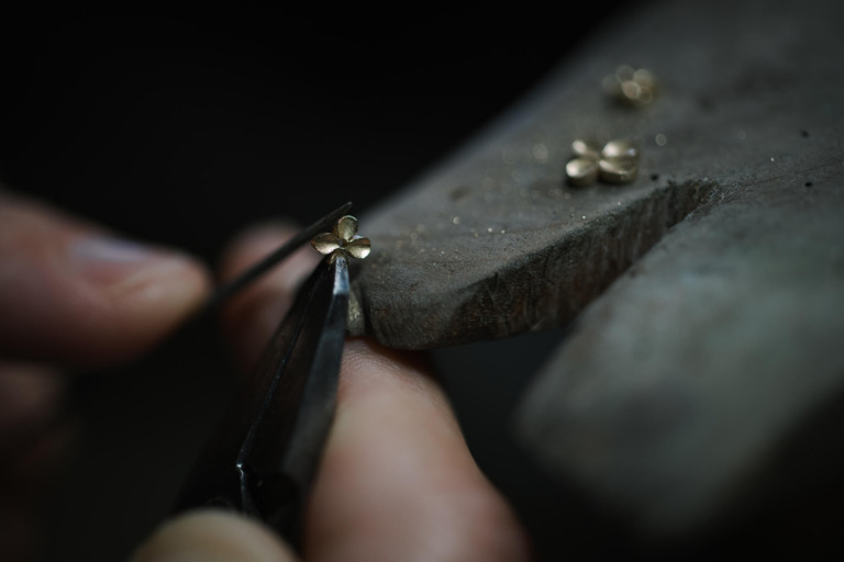 およそ5mmほどの大きさだろうか。 イエローゴールドをかたどって、小さな花の指輪を作っている。 重ねていくひとつひとつのタッチは、繊細でやさしい。 花はそれぞれに表情を変え、三つ揃えた。 … 続きを読む 素敵な出会いからはじまるジュエリーづくり #屋久島でつくる結婚指輪