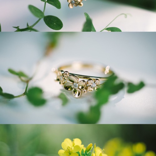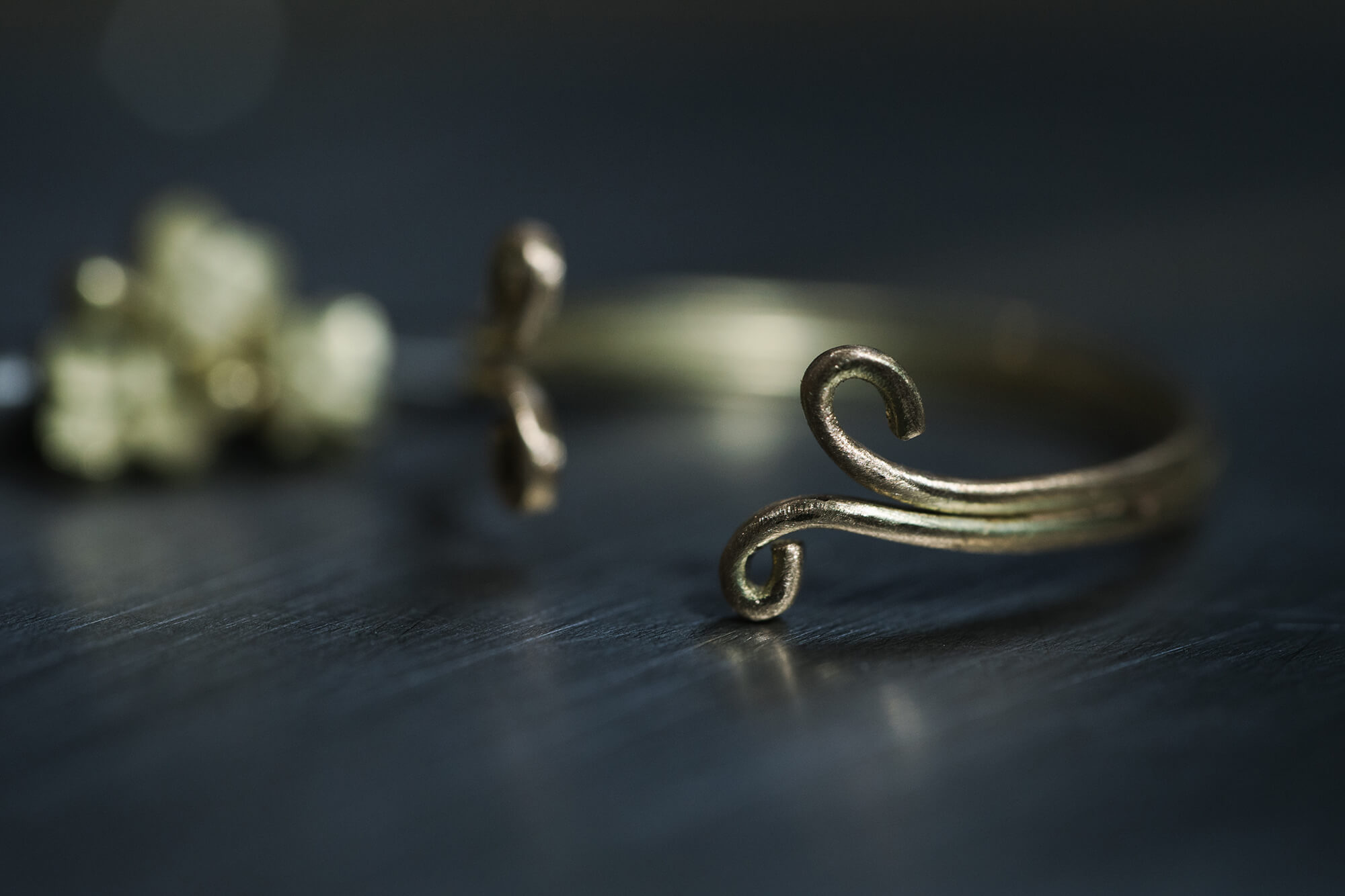 リングは、細いゴールドの線を二本合わせ、植物の茎のようにやわらかな表情に仕立てた。
