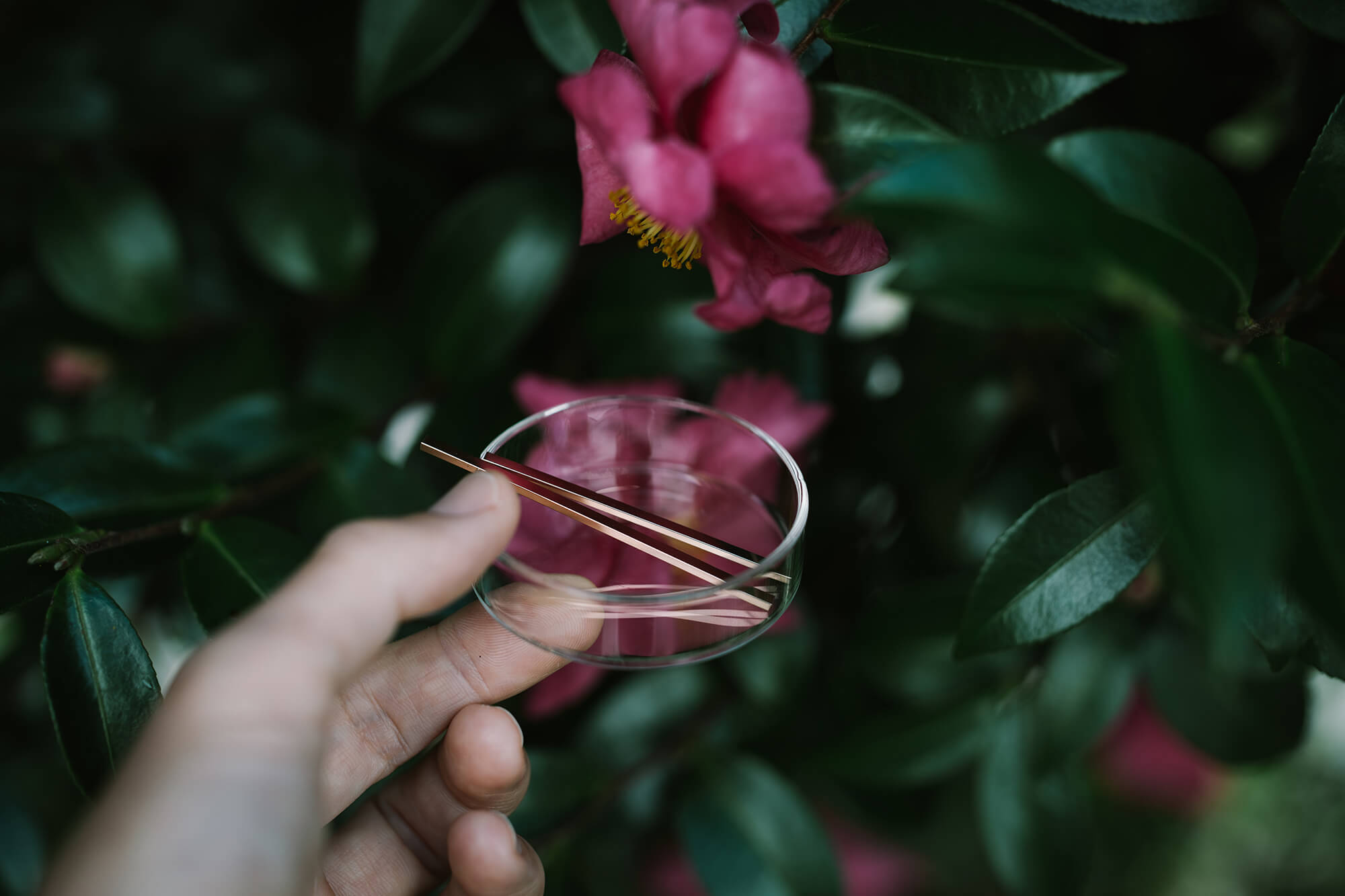 山茶花の下で、結婚指輪の素材となるピンクゴールドを眺めてみると、そこに和やかな響きのようなものが、ぽっと灯ったように感じられた。