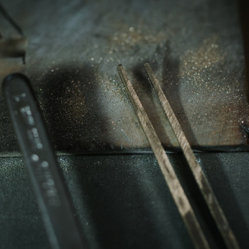 2本の細いシャンパンゴールドを、その両端をハンマーで叩いて細くし、ヤスリで表面を整えたところまでを書きました。