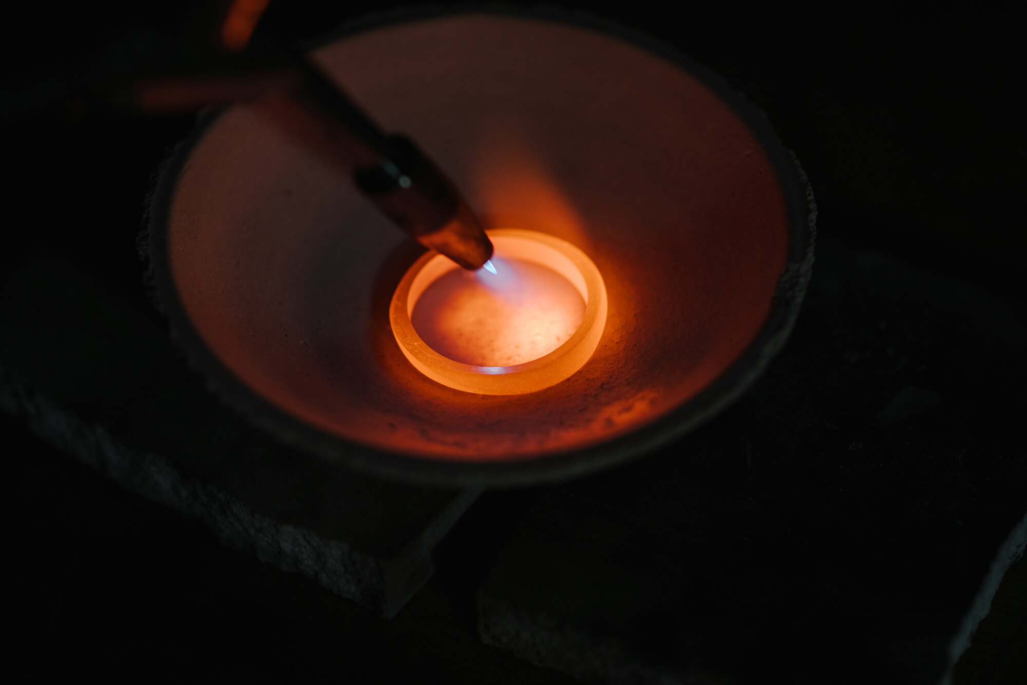 その工程を控え、酸素トーチの炎でプラチナを焼きなましておく。