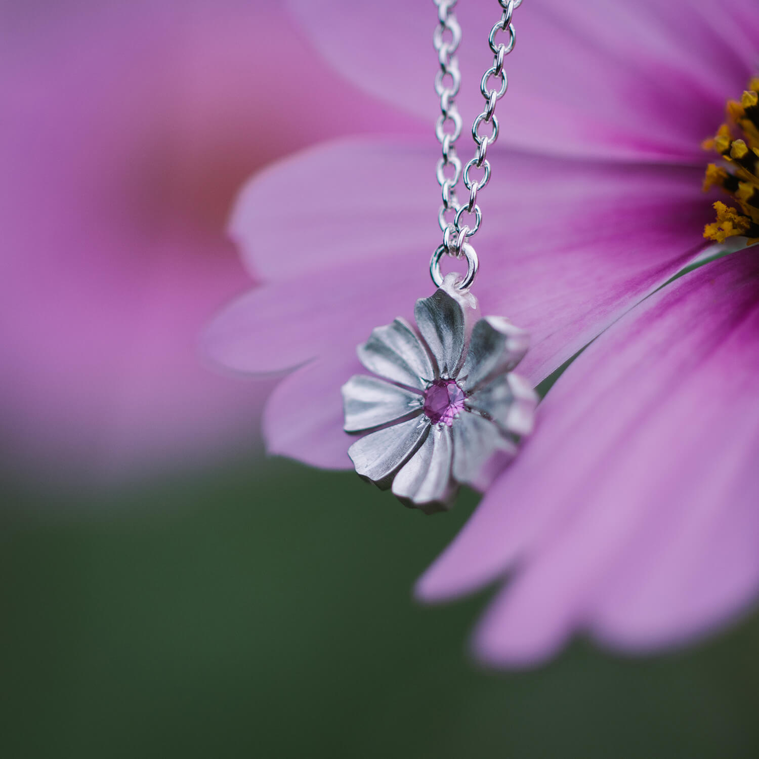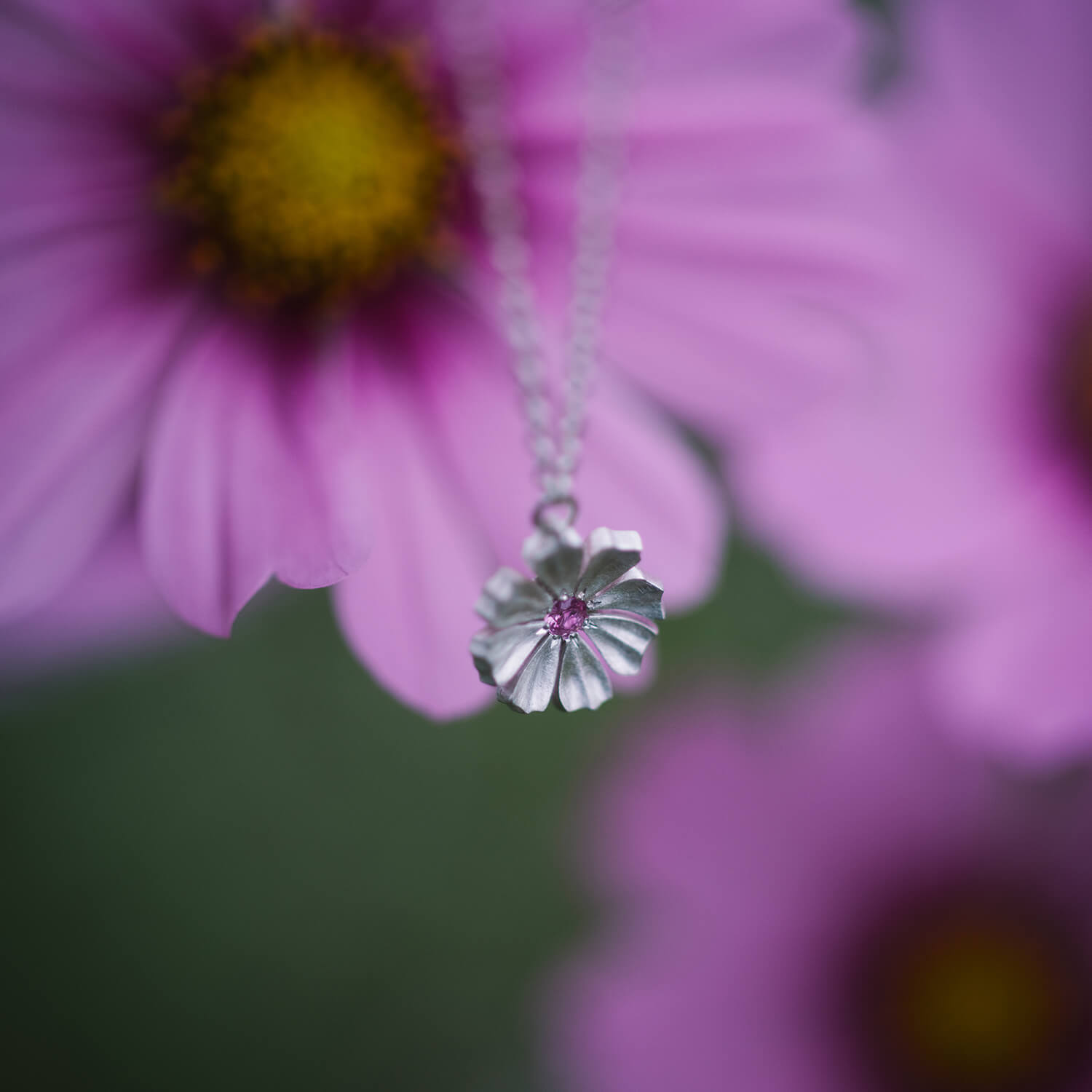 花のそばで眺めてみると、ピンクサファイアの色が響き合っていて、