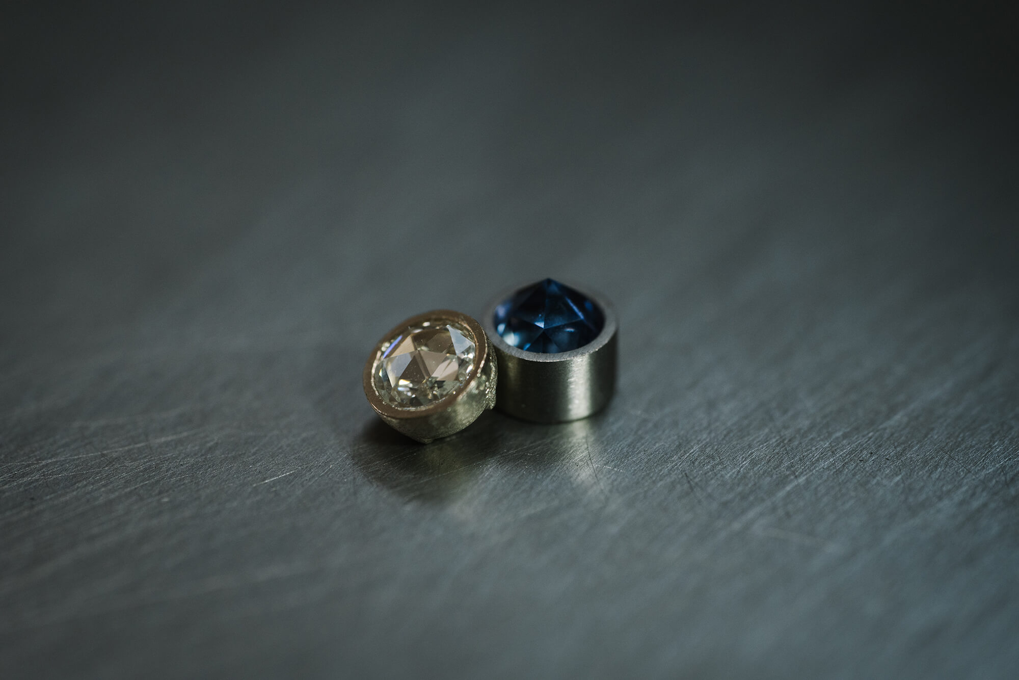 その丸い石枠に、透明のダイヤモンドをそっと添えてみると、まるで一滴の雫が宿ったように見えました。
