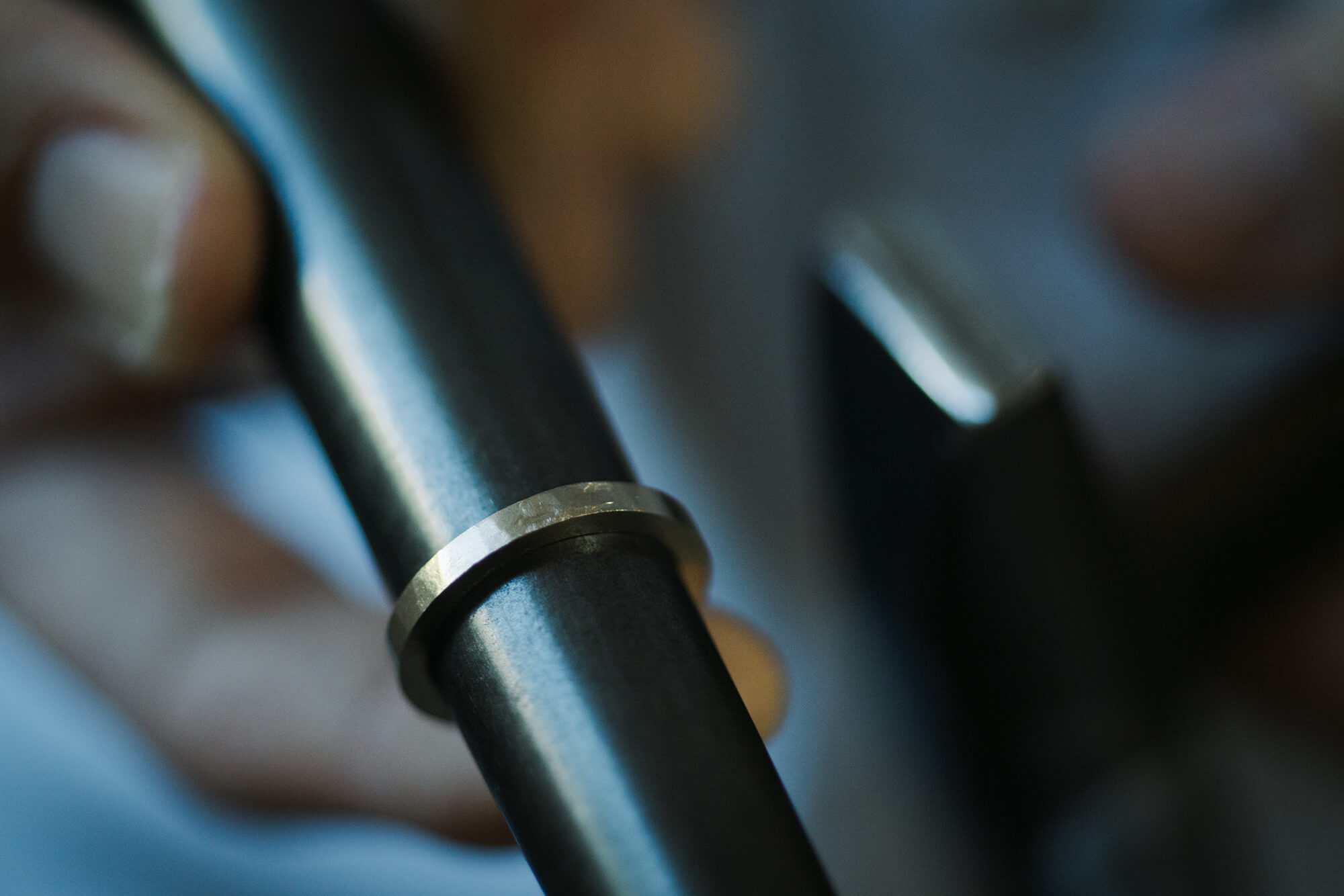 まずはボリュームのあるリングを造形し、金槌で叩きながら、サイズを整えていくところです。
