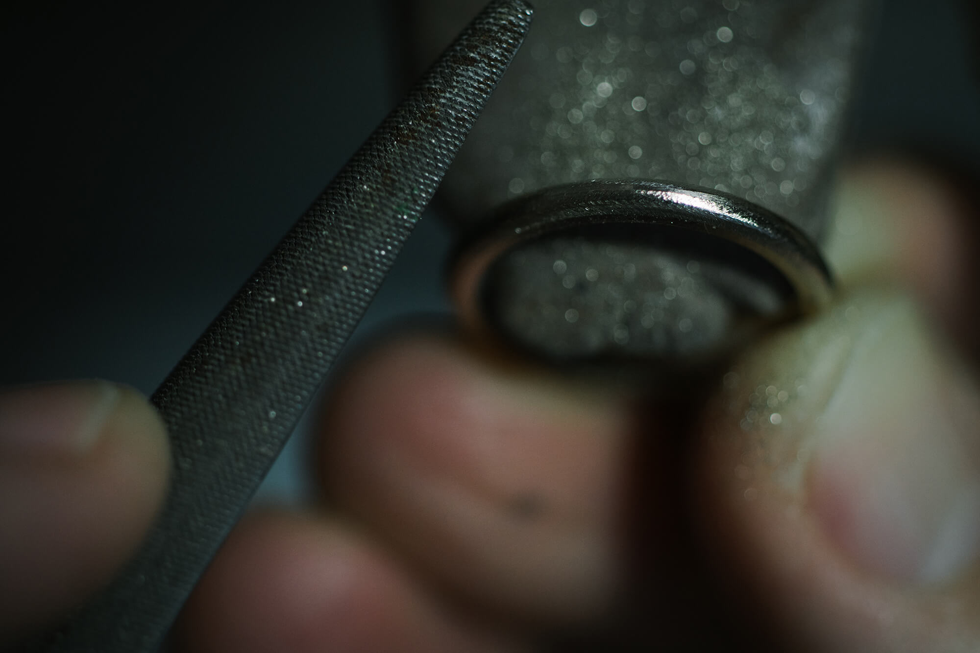 鉄鋼ヤスリを片手に、まずはリングの角を大きく削り落とす。
