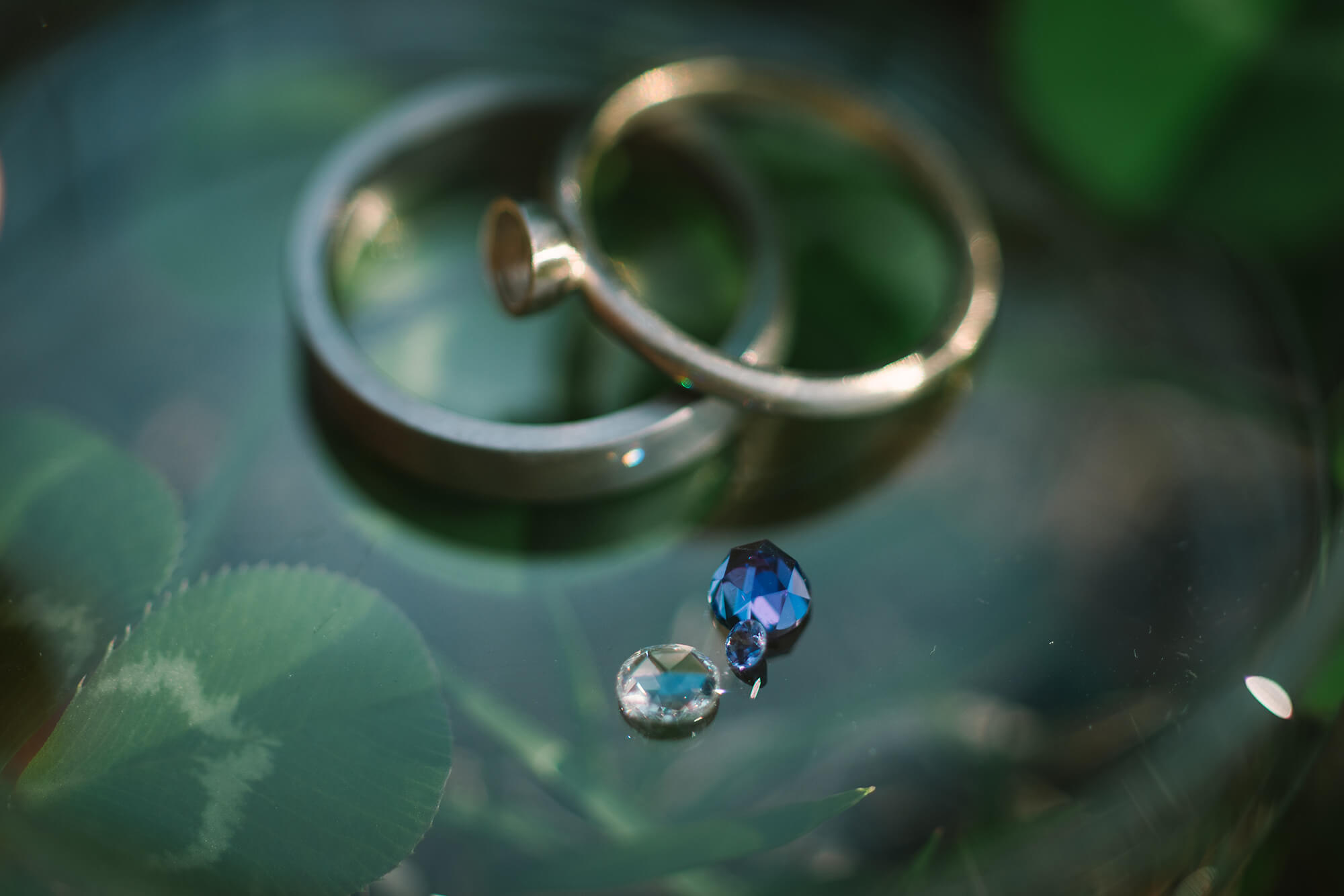そばに置いたダイヤモンドとタンザナイトが陽光を反射して、リングの表面にふたつの虹を映し出していた。