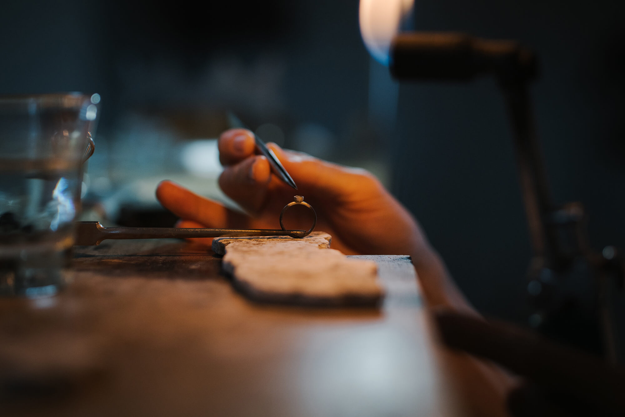 この瞬間は、おふたりの指輪づくりの中でも、とりわけ集中を要する場面かもしれない。