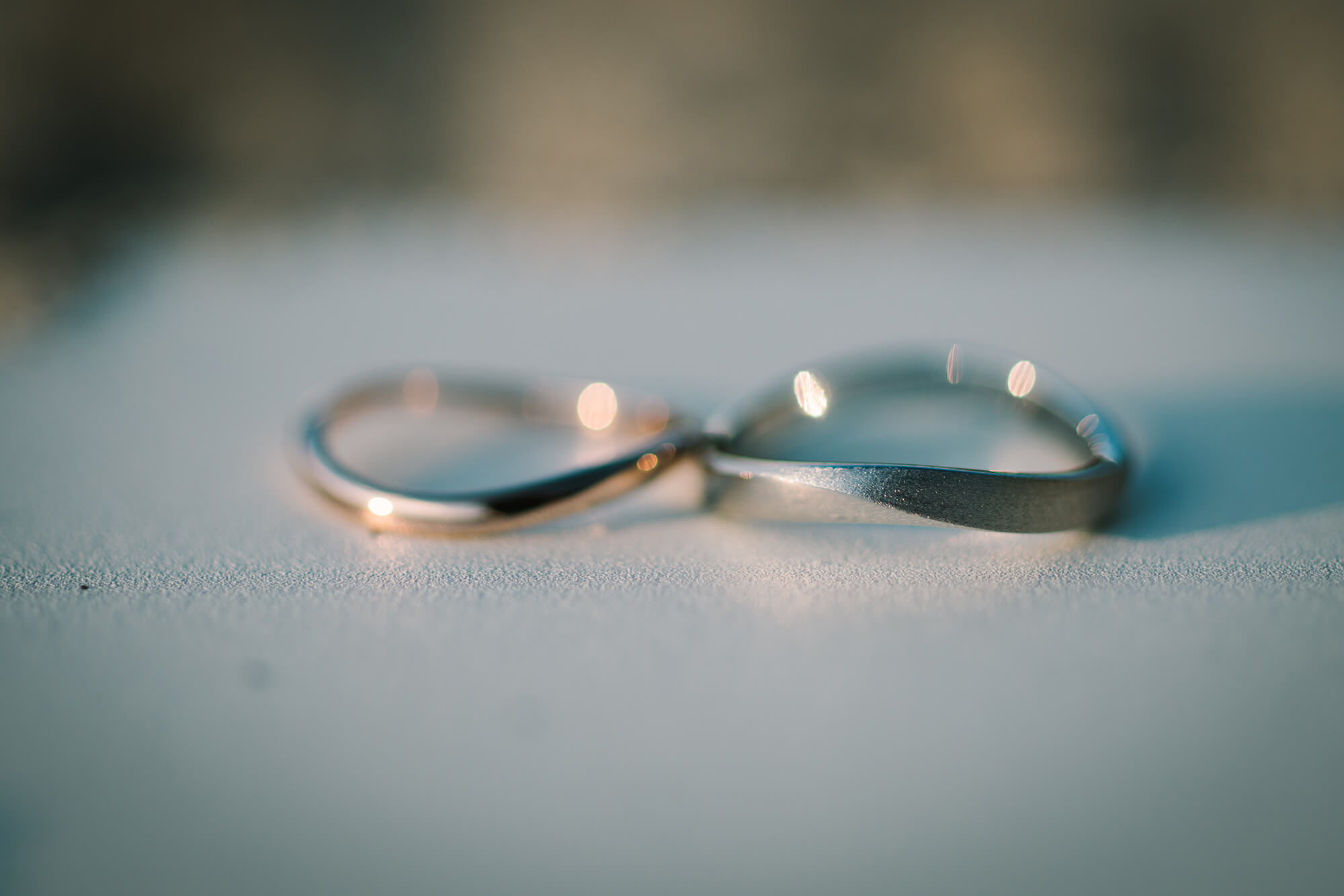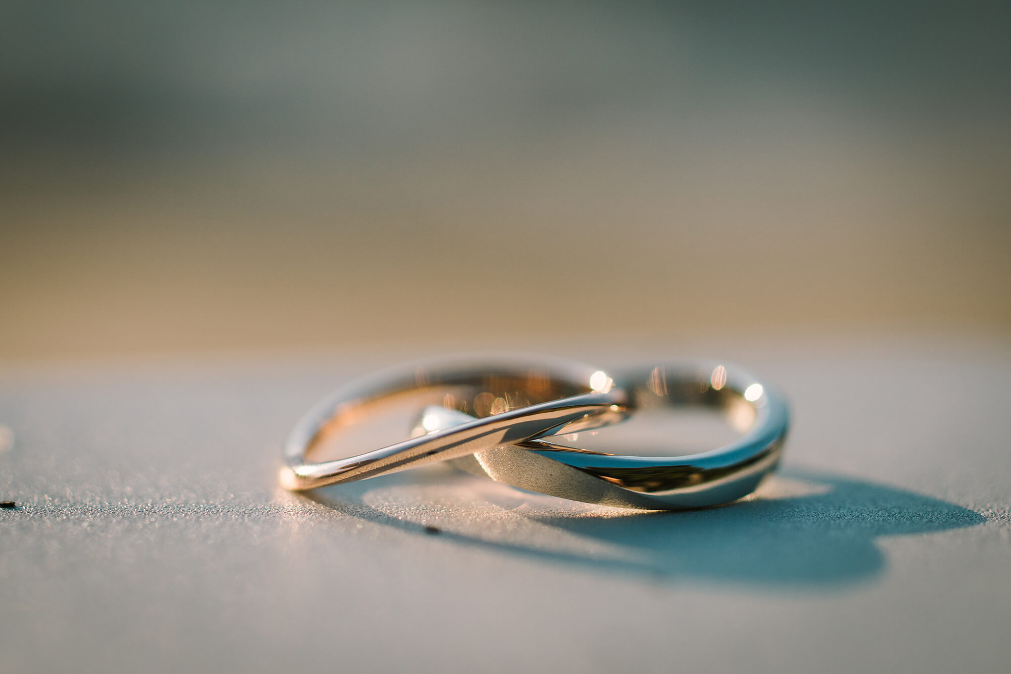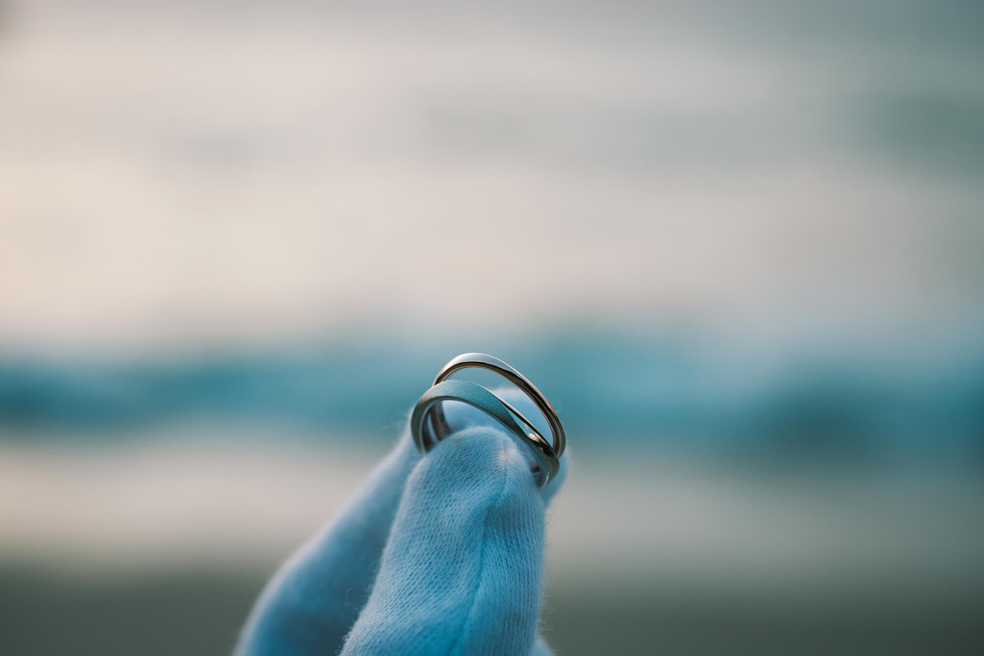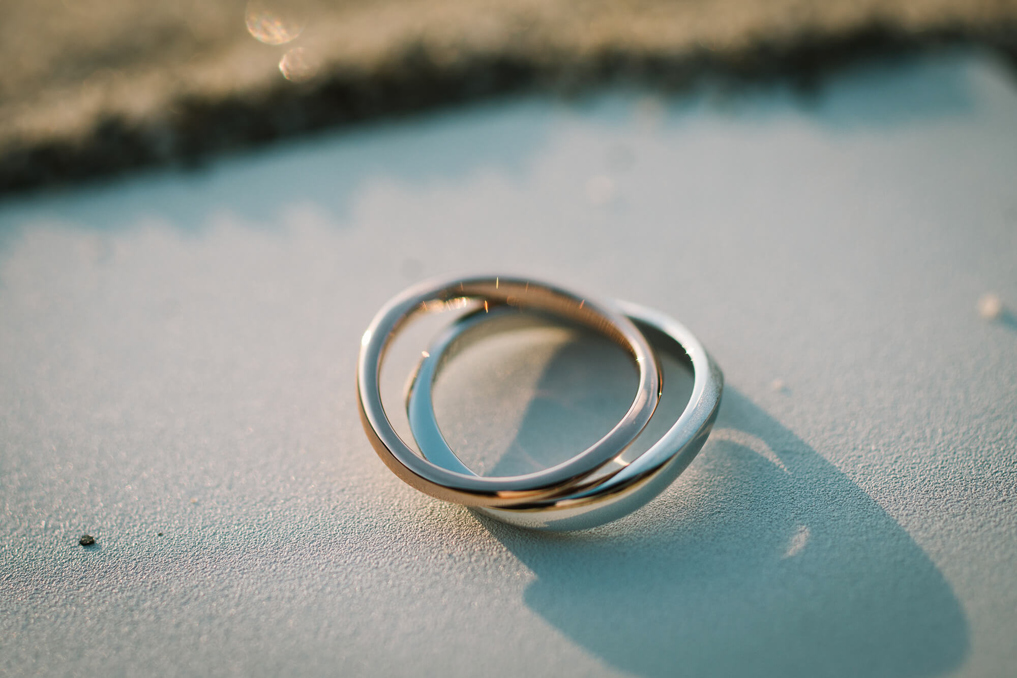 夕暮れ時の浜辺で眺めた、おふたりの結婚指輪。