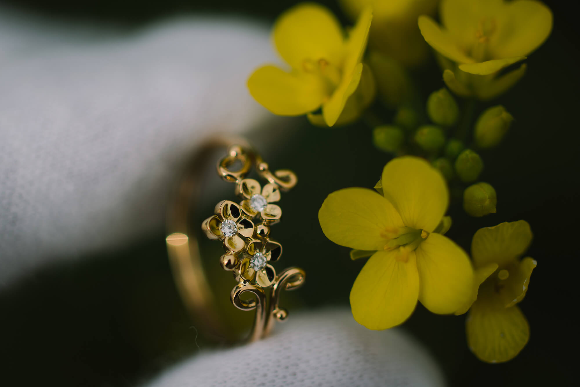 花の中央に一粒ずつ添えたダイヤモンドが、きらきらと眩しく輝くのが楽しくて、思わずリングをくるくると遊んでしまいました。