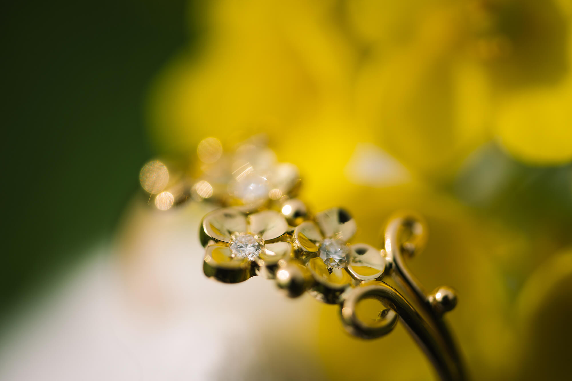 光沢仕上げのイエローゴールドが、花々を通り抜けて届く陽光を受け、やわらかな煌めきをまとっています。