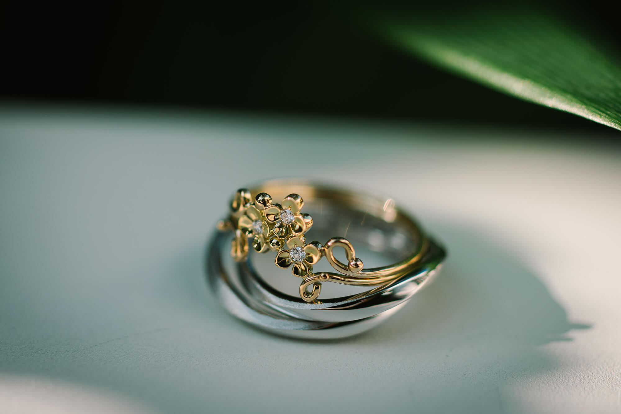 お二人がオーダーしてくれたのは、プラチナで揃えた結婚指輪と、菜の花の婚約指輪でした。