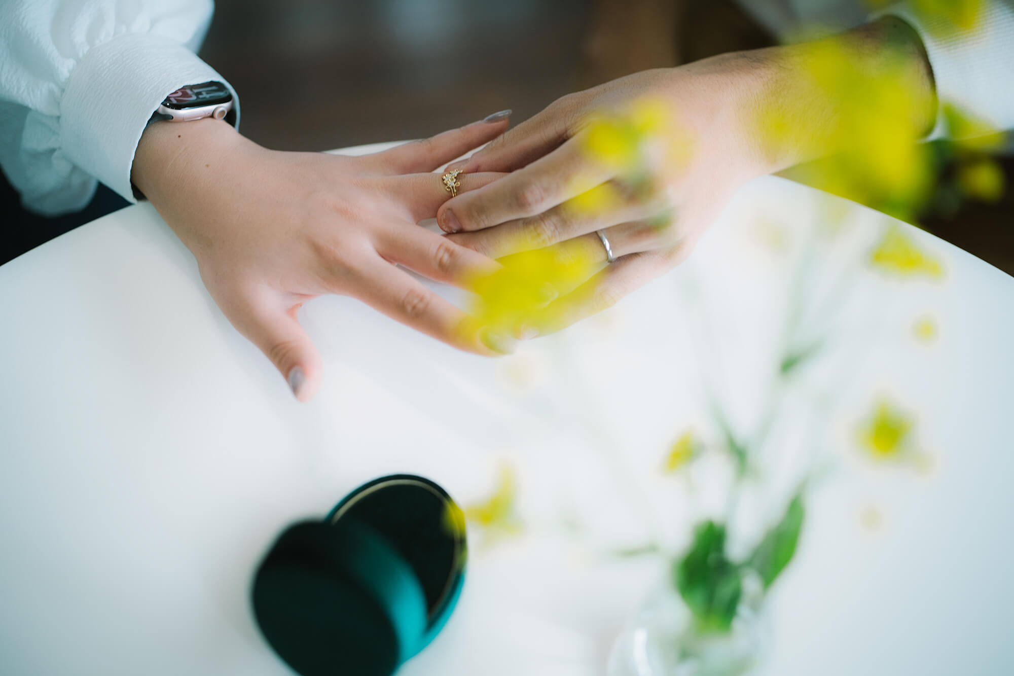 アトリエに飾った菜の花が、リングの交換を祝福するように、黄色いひかりで満たしてくれました。