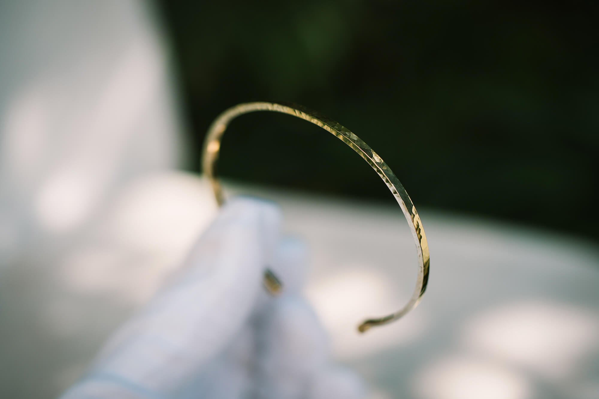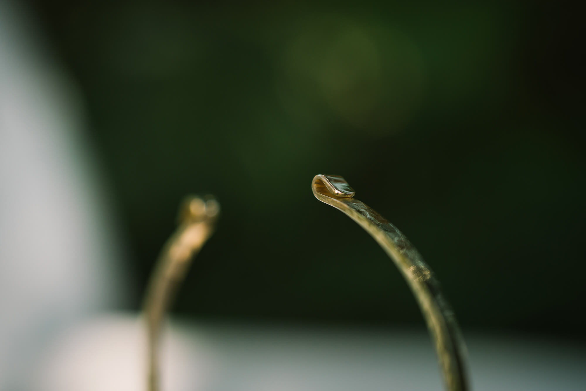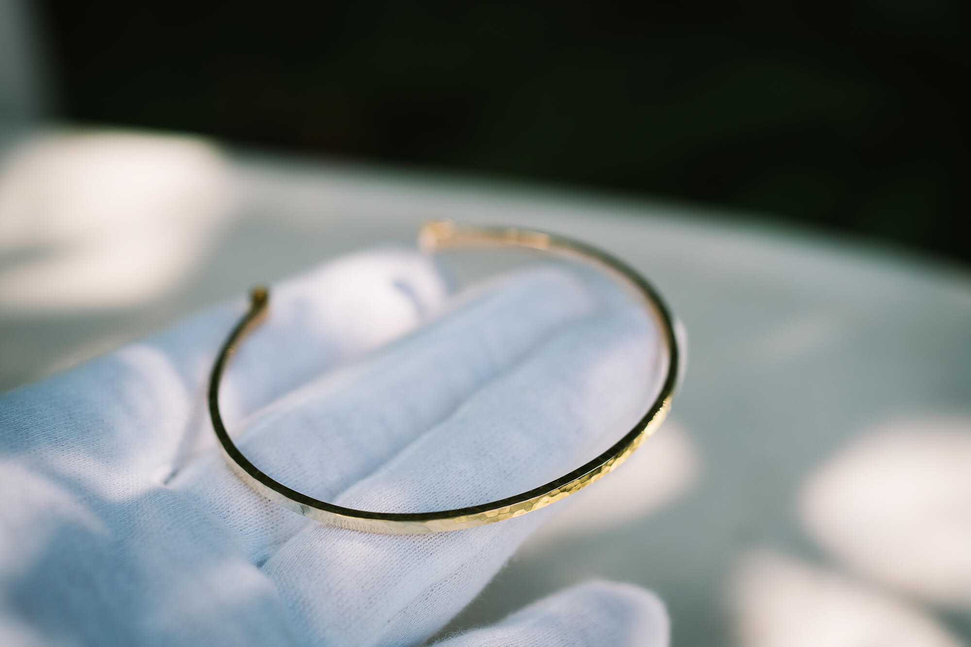 光沢仕上げを施したバングルが、まるで鏡のように島の緑を映し、