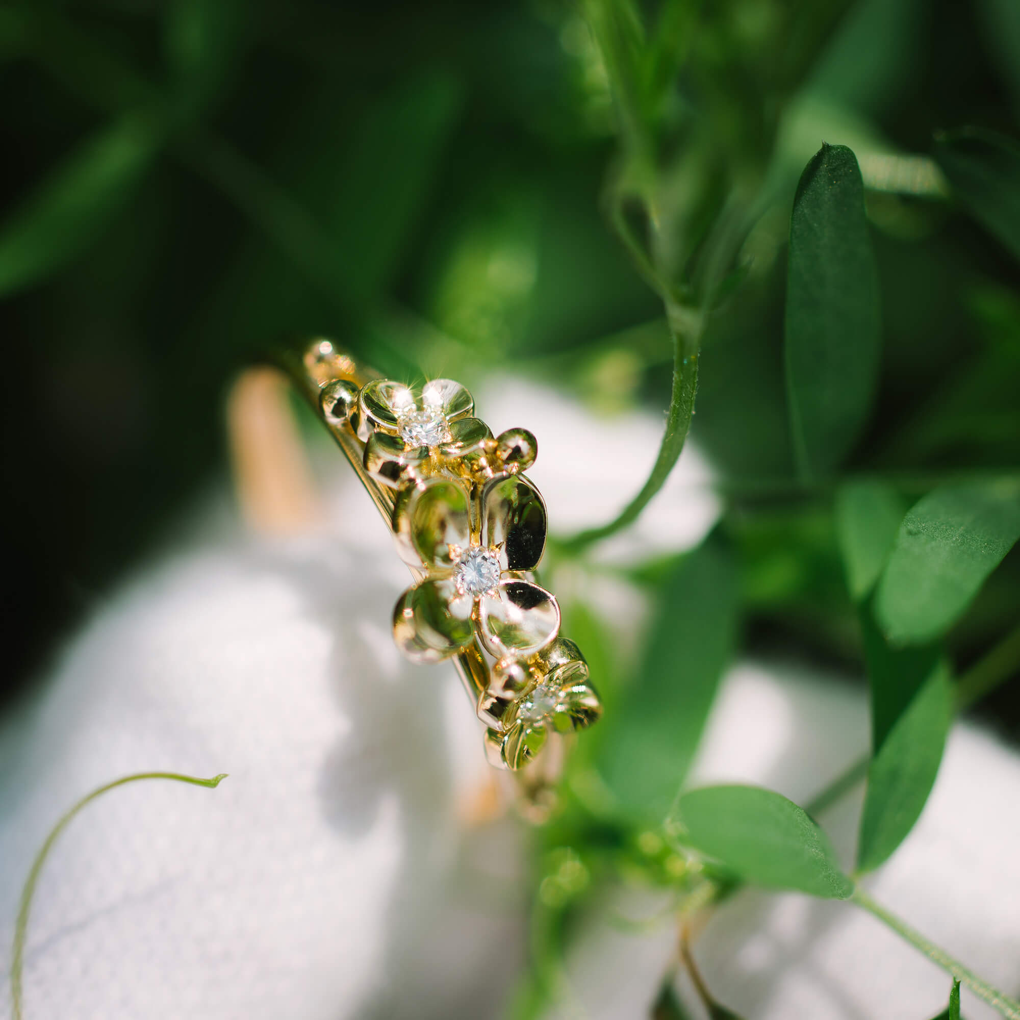 イエローゴールドの花とリングは光沢仕上げで整え、