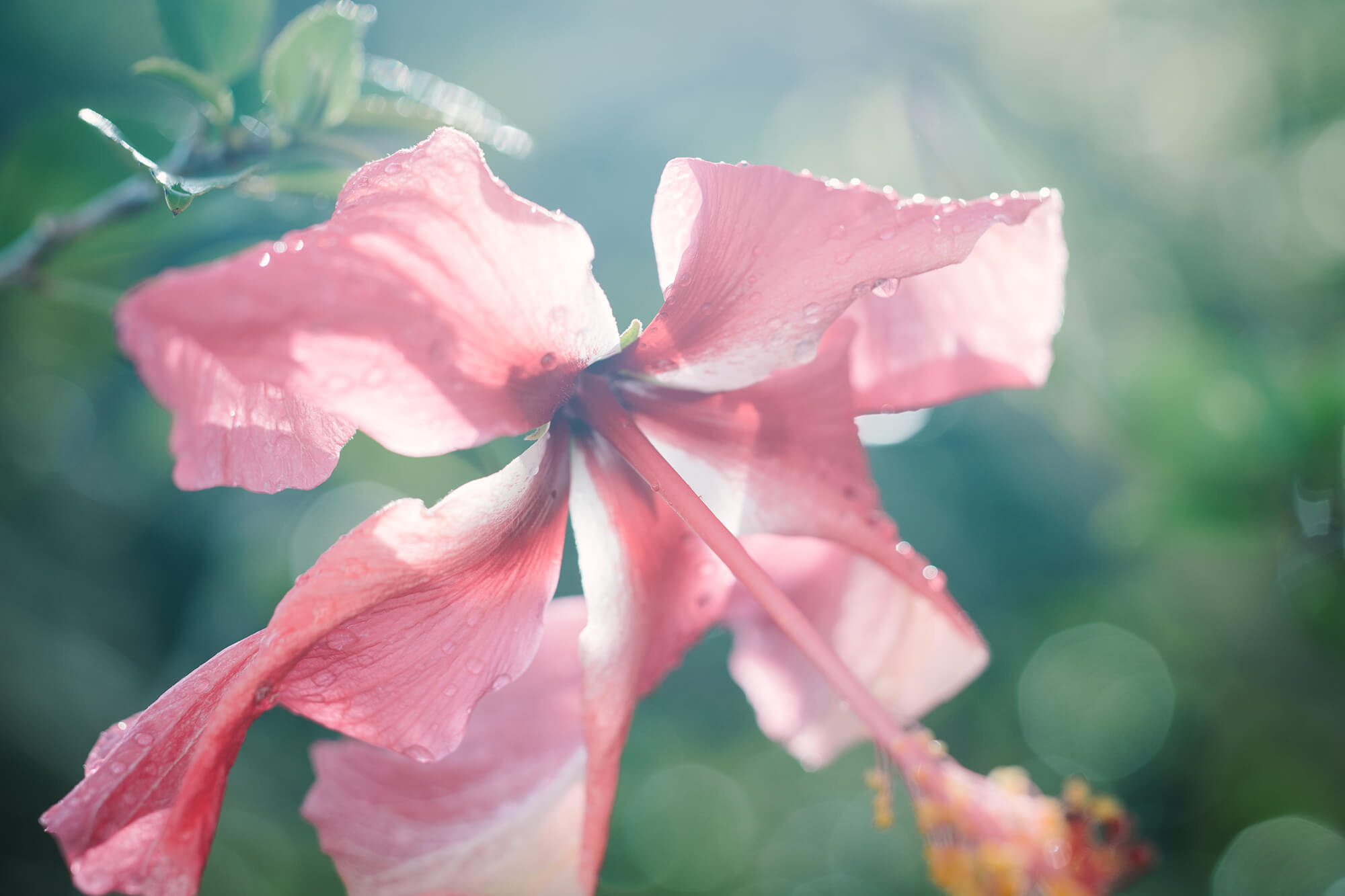 春の香りに導かれ、庭先に出てみると、光の中で大きなハイビスカスが煌めいていた。