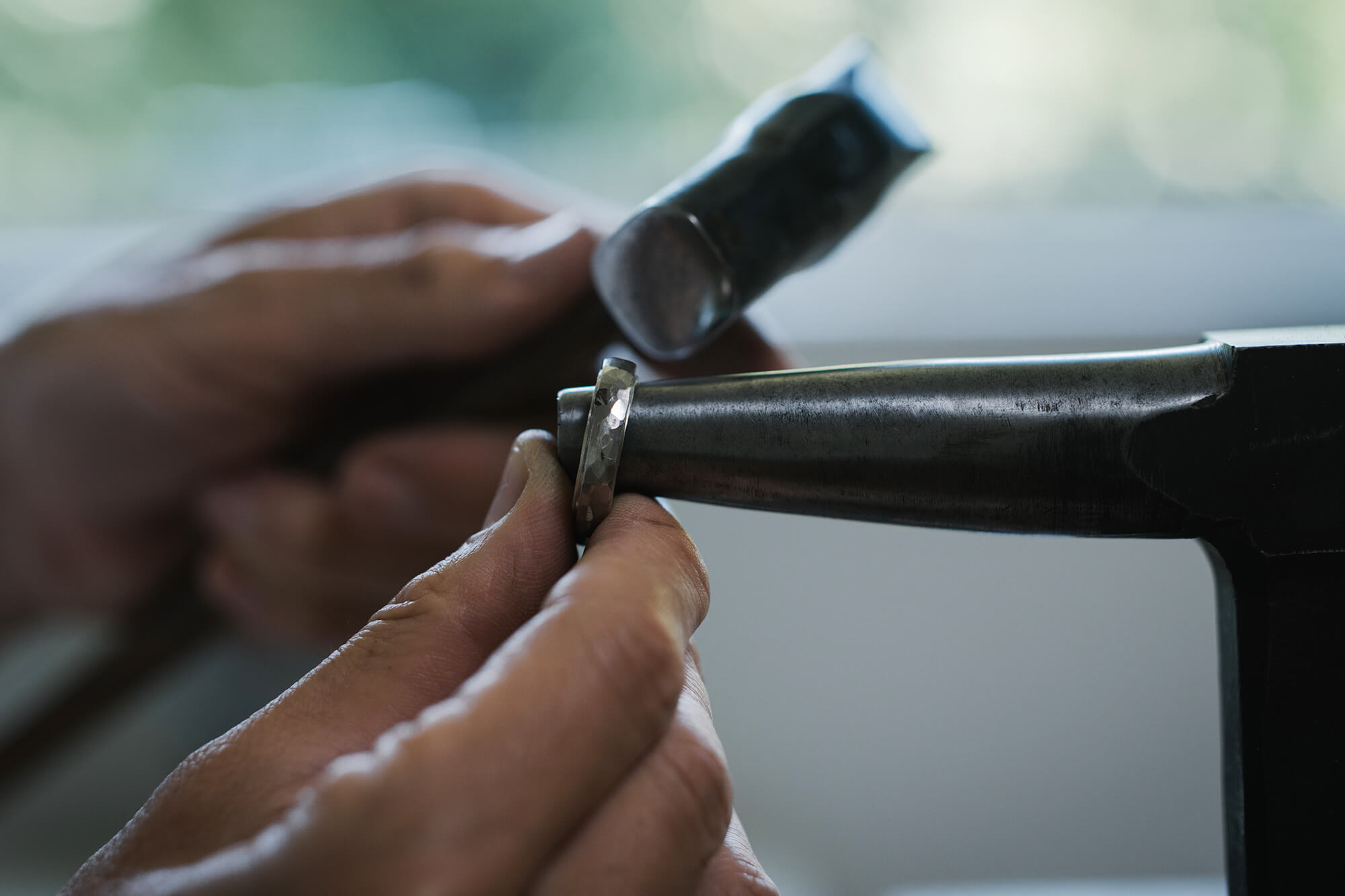 I work the surface of the ring with a hammer, applying firm, controlled strikes.