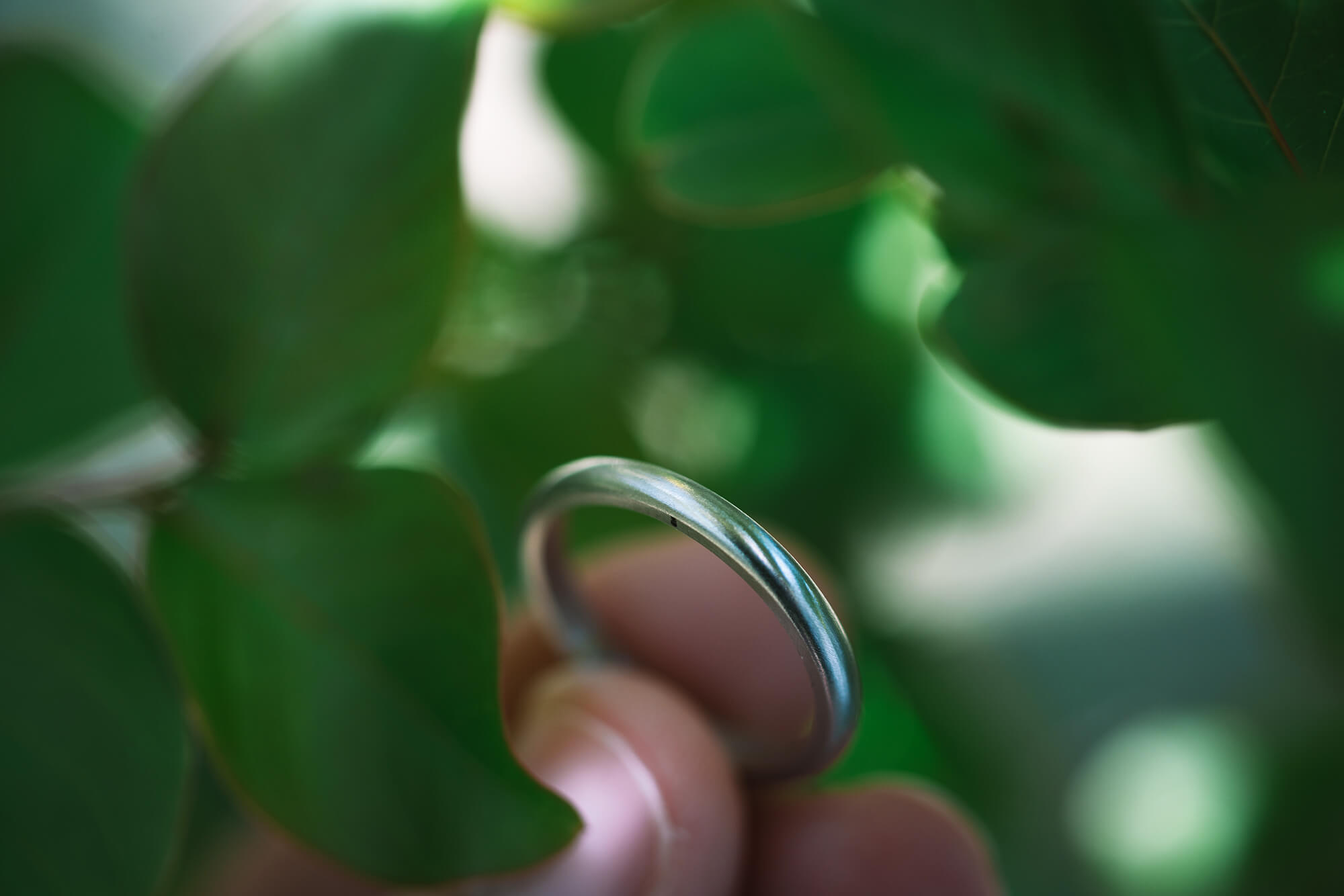 若葉をつけ始めた木の下でリングを手に取ると、プラチナは鏡のように島の緑を映んでいて、思わずうっとり。