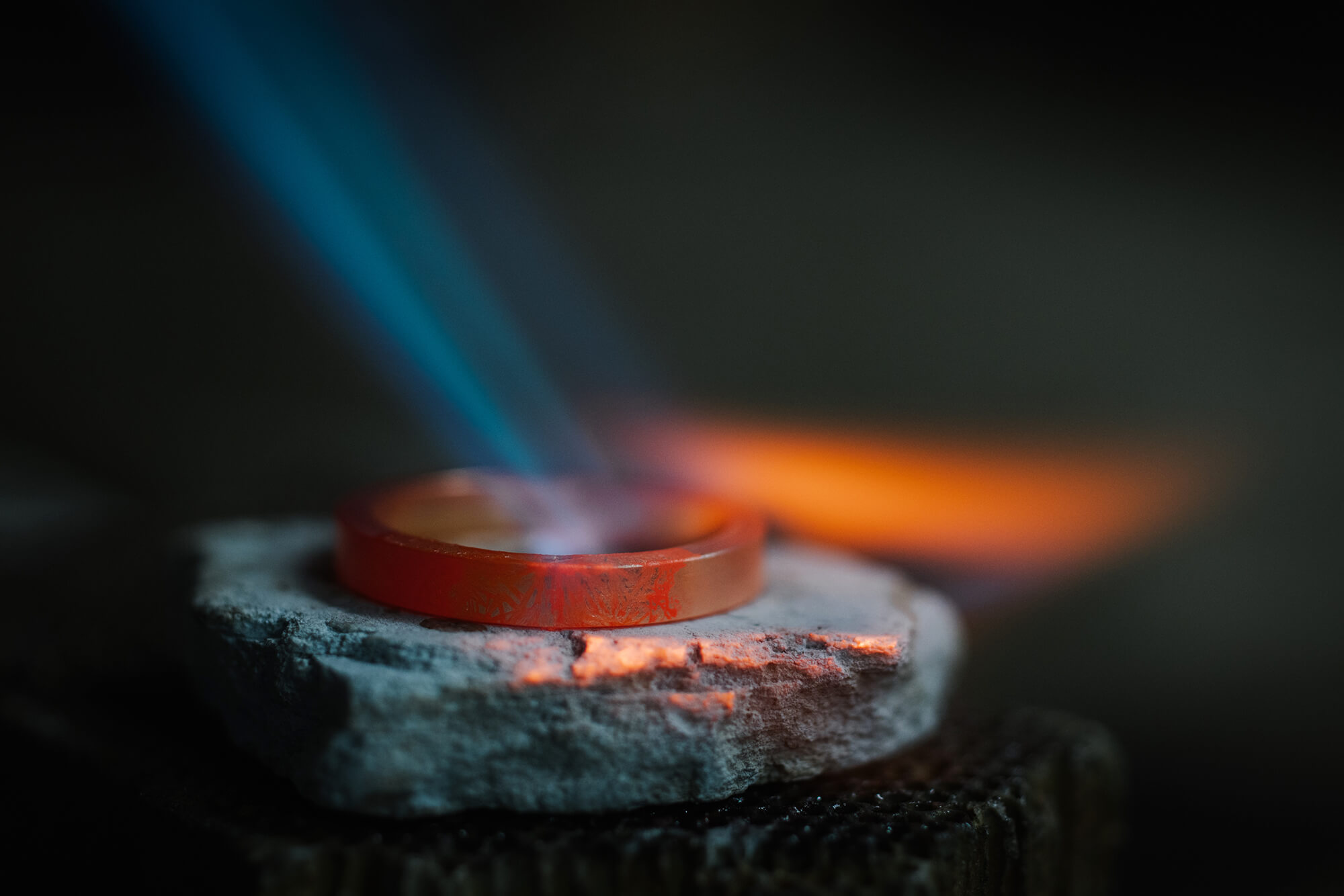 鉄の芯金にあてて丸く仕立てたリングを、再びバーナーの炎に包み、両端をぴたりと繋ぎ合わせた。